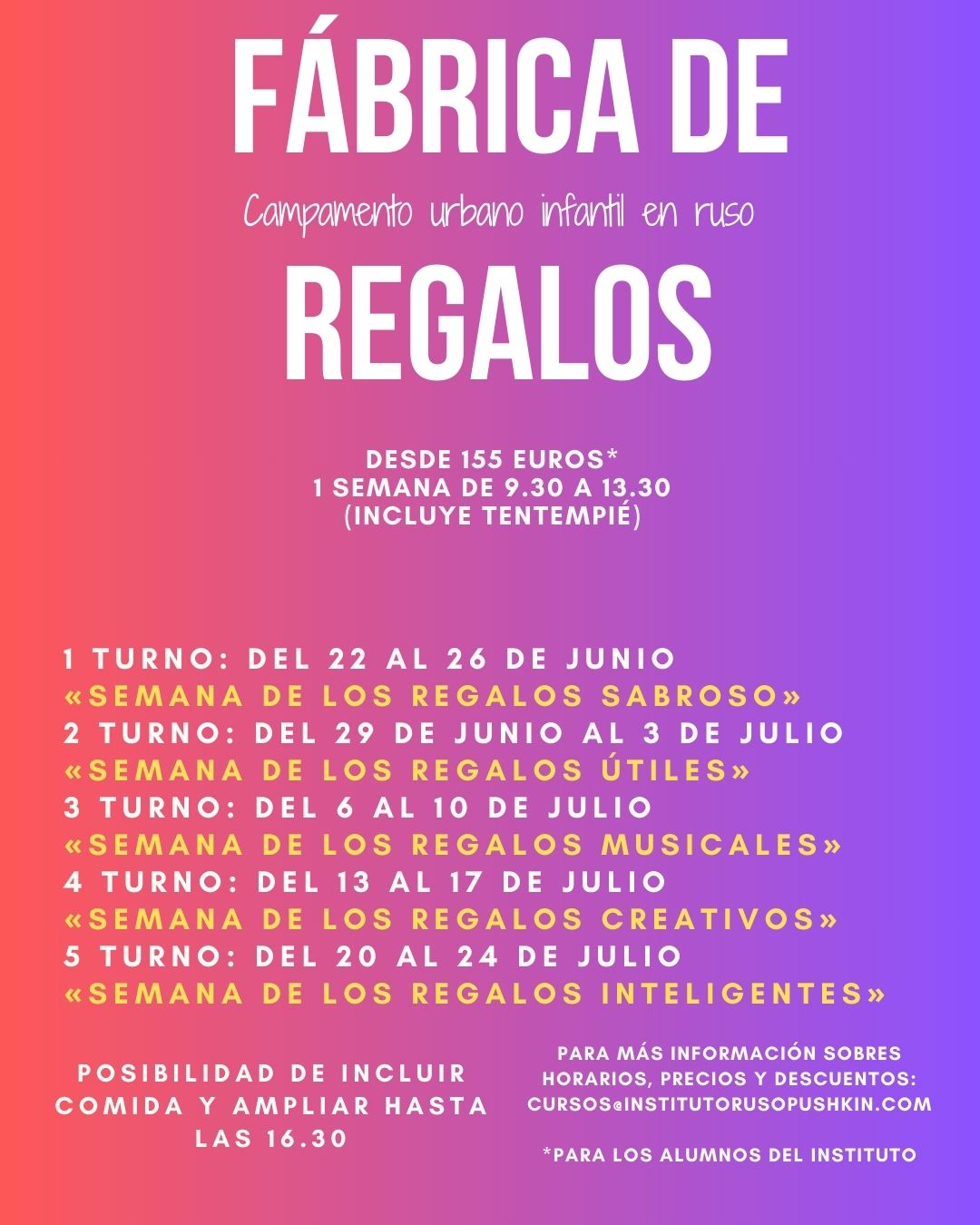 Van a jugar, cantar, bailar, pintar, cocinar y hacer ejercicio y a pasarlo bien con tus compañeros. ¡Y todo eso en ruso! Consulta toda la información escribiendo un correo a [email protected].